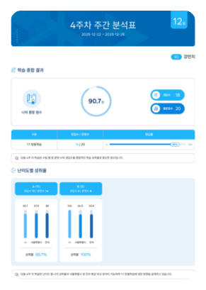 학습 결과를 주간 단위로 종합 분석해 학습 흐름과 성취도를 확인합니다.