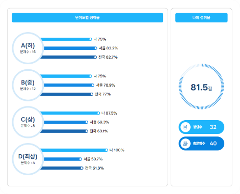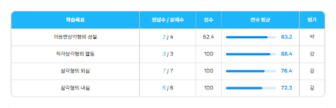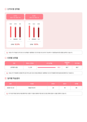 단원별·난이도별 학습 수준과 성적 변화 추이를 종합적으로 확인합니다.